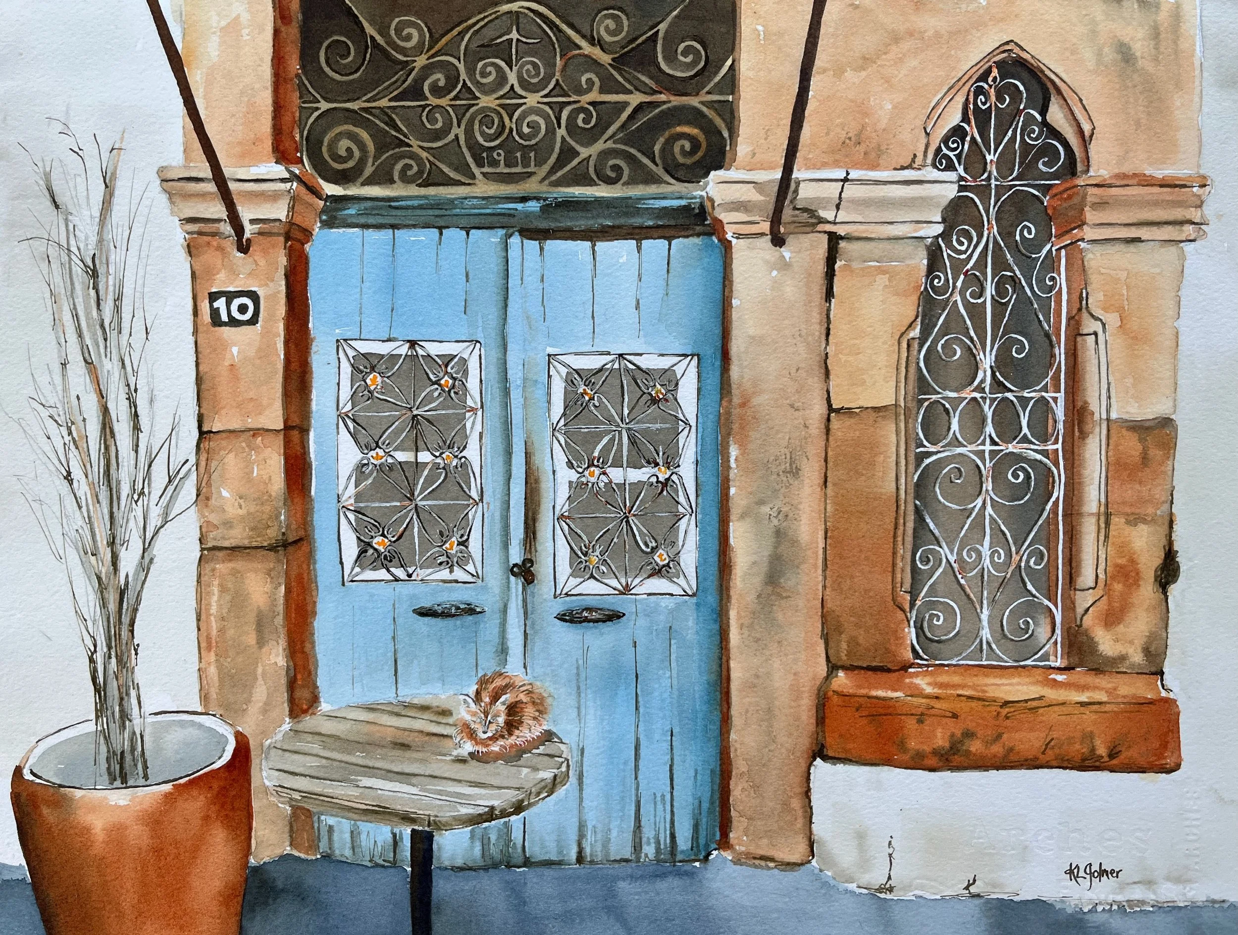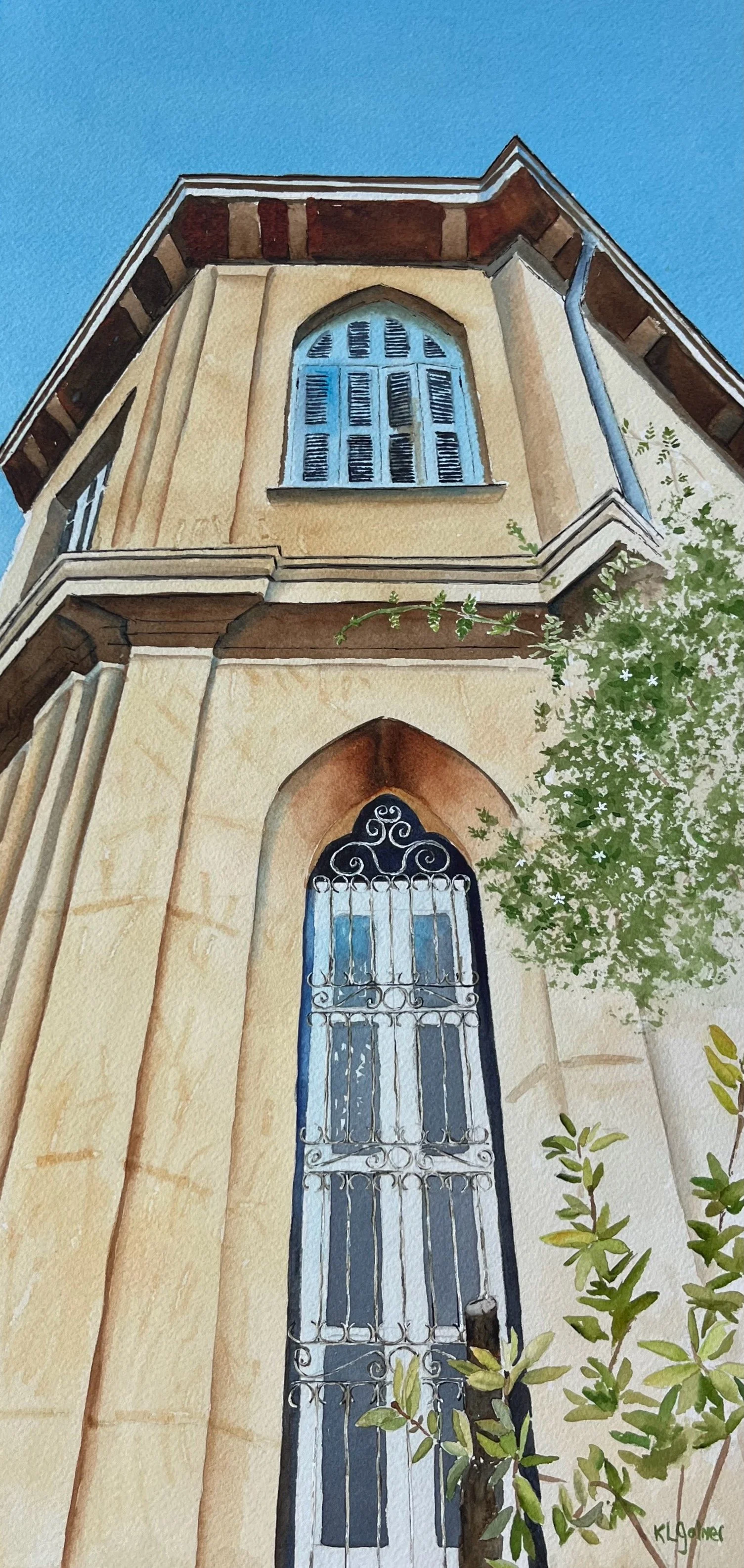 Looking up in NicosiaL framed watercolor 24 x 15”, $400